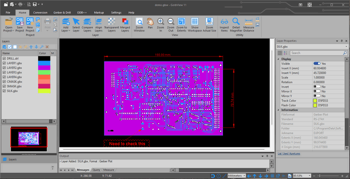 Особенности GerbView:- Просмотр, печать, разметка и преобразование Gerber, Adobe PDF, ODB++, Excellon, Autodesk DXF и HPGL/2.