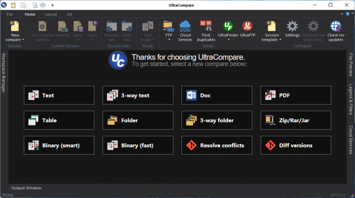 Ключевые возможности UltraCompare:• Сравнение файлов. UltraCompare включает в себя гибкий механизм сравнения, позволяющий сопоставлять до 2 – 3 файлов/папок одновременно. Предусмотрена поддержка функций Drag-and-drop, Inline-редактирования, слияния блоков и строк, управления сеансами, генерации отчетов по найденным различиям и многие другие.