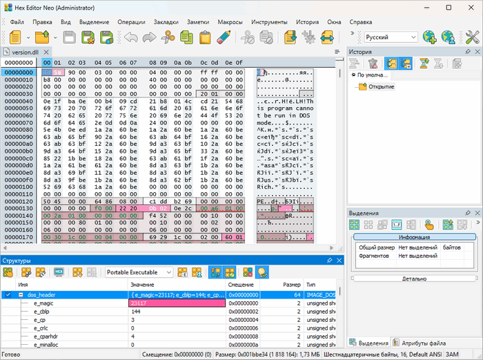 Hex Editor Neo Ultimate – профессиональный редактор шестнадцатеричных, десятичных и бинарных файлов для Windows. Программа имеет возможности по выделению, просмотру, редактированию, замене, отладке и анализу данных. Позволяет составлять пакеты в два щелчка мыши, манипулировать Вашими EXE, DLL, DAT, AVI, MP3, JPG файлами с неограниченной по функцией отменой и возвратом действия. Неограниченная история изменений файла с визуализацией и возможностью её сохранения и загрузки.