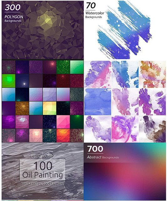 Этот комплект предлагает вам большое разнообразие фонов: • Полигон • Акварель • Картина маслом • Абстрактный • Движение • Мрамор • Абстрактный размытый свет • Геометрический • Полутона