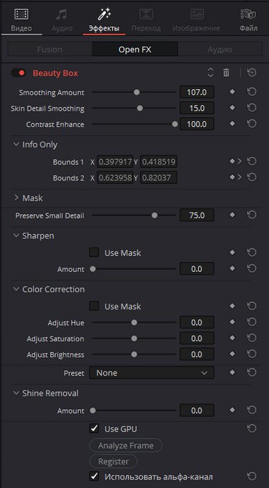 Beauty Box Video плагин для DaVinci Resolve Studio прост и автоматизирован в использовании, это плагин для ретуши кожи и цифрового макияжа автоматически определяет оттенки кожи и создает маску, которая ограничивает эффект сглаживания областями кожи.