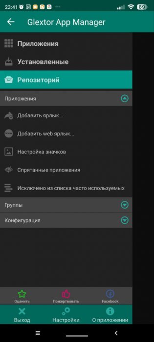 Экспорт конфигурацииНет нужды каждый раз заново настраивать Glextor AppManager и группировать установленные приложения. Просто сделайте бэкап текущей конфигурации и восстановите её на новой системе в одно касание.