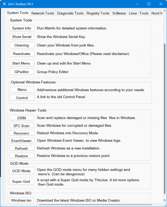 With this utility you can fix your Windows Install, diagnose your Windows Install, fix the registry, add functions, fix bugs, quickly install software after a clean install, change the look of your Windows Install. Diagnose and change your network settings . Many quick links to functions which are buried in the Windows Settings and even access to the Windows GOD mode.