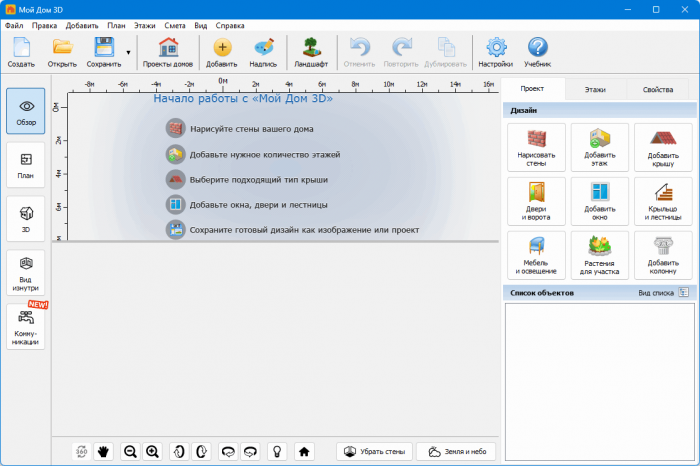 Мой Дом 3D — это российская программа для самостоятельного проектирования домов. Вы сможете создать поэтажный план здания с мансардой и цокольным этажом, пристроить крыльцо, лестницу. Внешнюю и внутреннюю отделку меняйте по своему усмотрению. В каталоге есть 1150+ материалов и возможность загрузить свое фото обоев, линолеума и прочих покрытий.