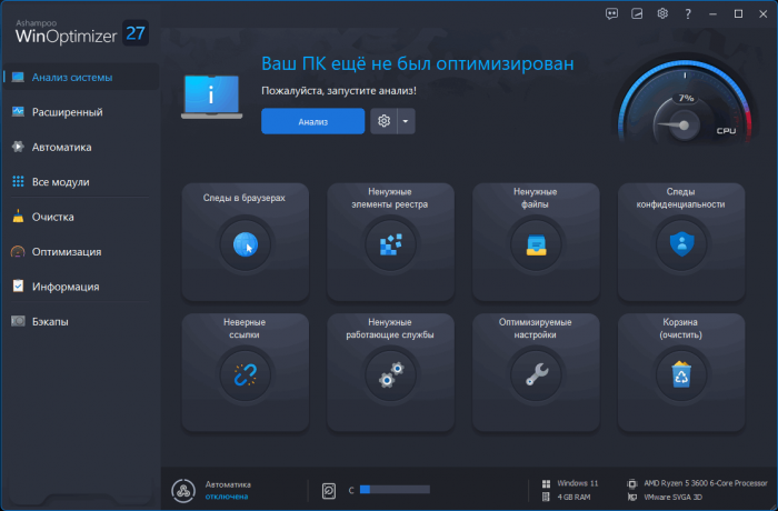 Ashampoo WinOptimizer 27 ты автоматически получаешь наилучший опыт работы с Windows. Новая система автоматизации ускоряет, очищает и настраивает твои приложения. Благодаря новому модулю Profile Booster твой компьютер легко адаптируется к твоим потребностям благодаря приоритизации процессов, автоматической очистке временных файлов и настраиваемым конфигурациям профилей. Будь то игры, работа или просмотр веб-страниц, повышение производительности твоей системы или экономия ресурсов - выбор за тобой. Новый Crash Analyzer позволяет получить глубокое представление о сбоях системы и их причинах, а четыре усовершенствованных средства очистки обеспечивают конфиденциальность и обслуживание системы. Благодаря улучшенному управлению памятью WinOptimizer теперь может использовать больше ресурсов для проведения всестороннего анализа практически мгновенно!