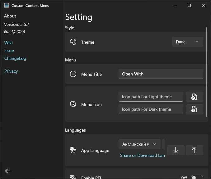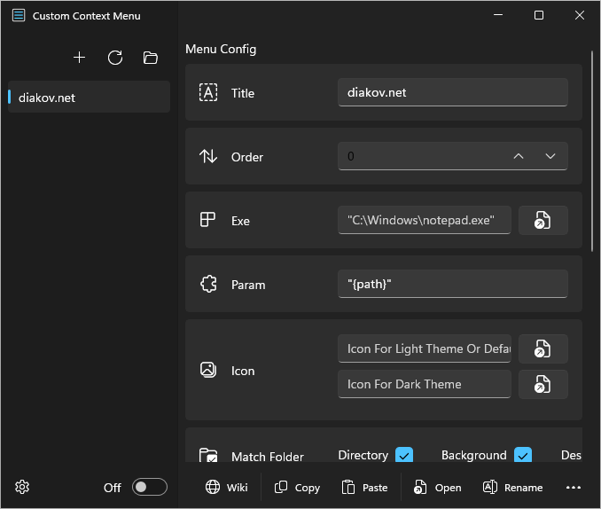 По умолчанию установлена одна корневая запись контекстного меню. Щелчок по значку настроек отображает параметры для изменения имени корневой записи. Изменения должны быть сохранены, прежде чем они станут доступными. Изменения применяются после перезапуска процесса explorer.exe, перезагрузки системы или выхода из учетной записи и повторного входа. Все данные хранятся в файле JSON.