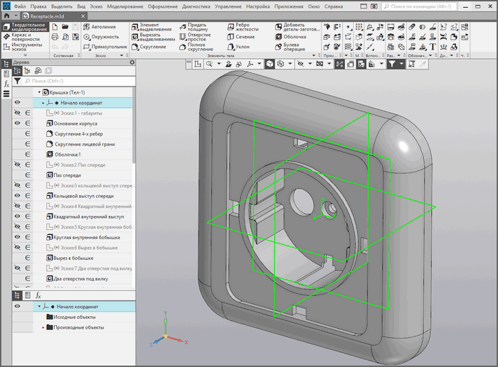 - развитый инструментарий трёхмерного твердотельного, поверхностного и параметрического моделирования;