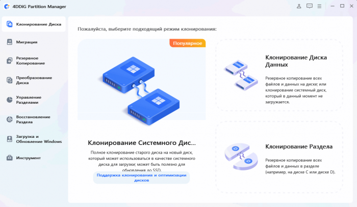 4DDiG Partition Manager — это надежный инструмент для управления разделами Windows. Он может не только помочь вам перенести Windows OS на SSD без переустановки системы, но и помочь вам клонировать весь ваш диск или раздел для обновления диска.
