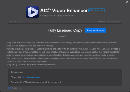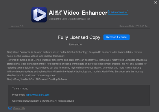Digiarty Aiarty Video Enhancer - программа на базе искусственного интеллекта для генерации дополнительных деталей, мощного шумоподавления, устранения размытия, масштабирования и восстановления поврежденного видео до 4K-четкости. Благодаря специализированным ИИ-моделям достигается высокое качество изображения, что делает программу идеальной для видеоблогеров и энтузиастов.