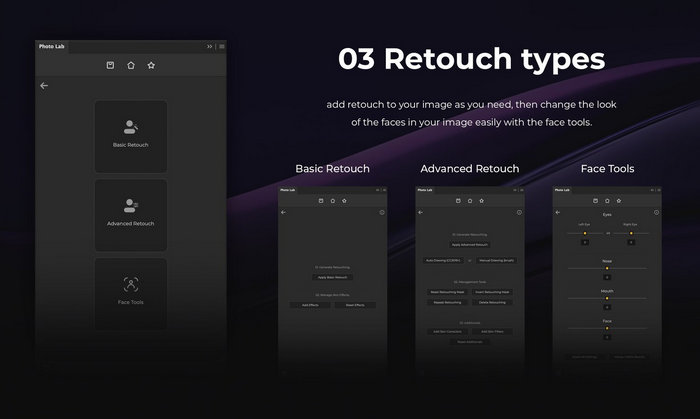 - Расширенная ретушь: примените профессиональную ретушь и расширенные инструменты для управления ею.
