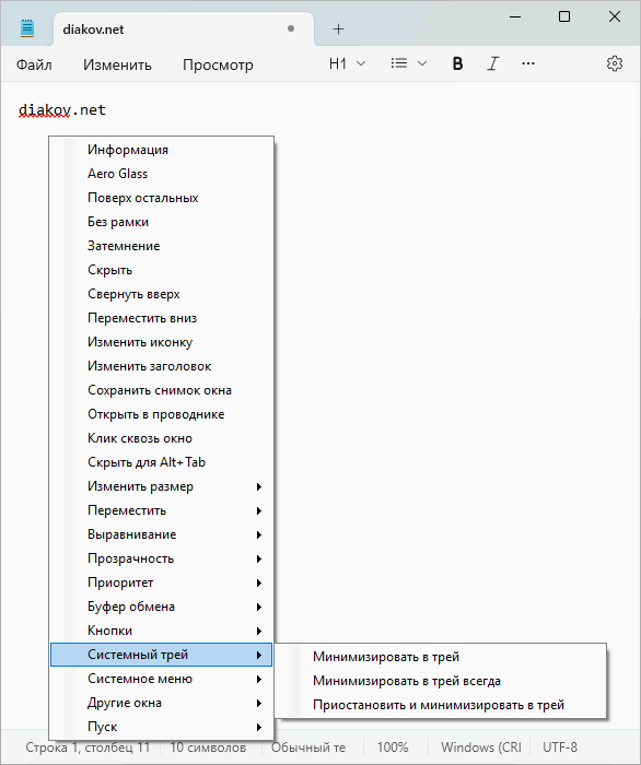 - Свернуть в трей: Минимизирует или приостанавливает окно в системный трей.