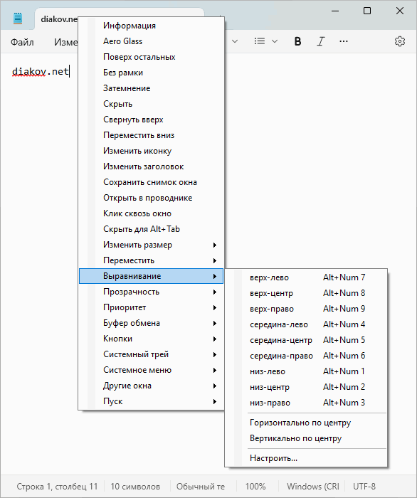 - Выравнивание: Размещает окно в одной из 9 позиций рабочего стола.