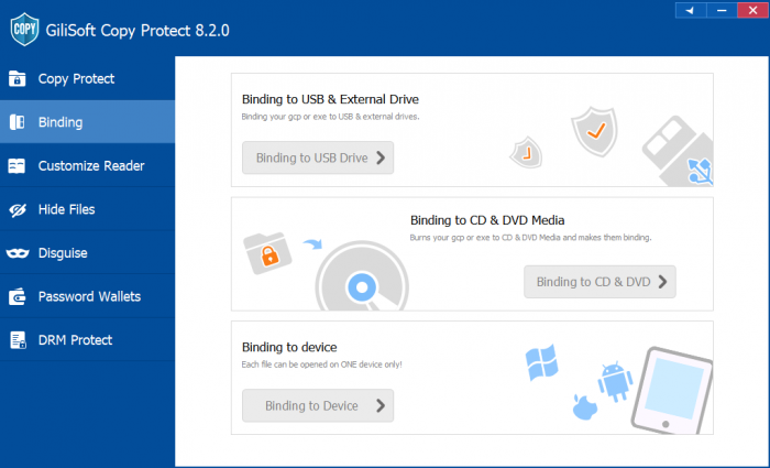 Привязка файлов к устройствамGiliSoft Copy Protect позволяет привязать файлы к определённому устройству, внешнему диску, USB-накопителю, CD или DVD. Эта функция обеспечивает дополнительный уровень безопасности, ограничивая доступ к файлам только на определённых устройствах.