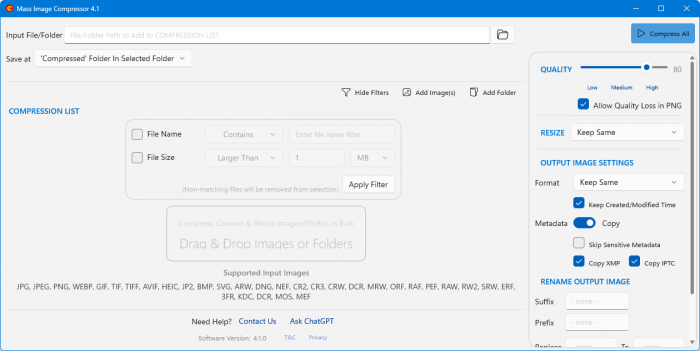 Mass Image Compressor — оптимизация, изменение размера, преобразование изображений и видео с водяными знаками для всей папки. Пакетный оптимизатор фотографий, средство массового изменения размера и конвертер изображений для форматов JPEG, WebP, HEIC, AVIF и анимации. Поддерживает нанесение водяных знаков на фотографии с изображением вашего логотипа. Позволяет сократить количество преобразований RAW в JPEG до 90% и до 50% для PNG. Поддерживает расширенное сжатие для WebP и AVIF. Поддерживает такие форматы, как Canon CR2/CR3, Sony ARW, Nikon NEF, Fuji RAF, Panasonic RW2 и многие другие.