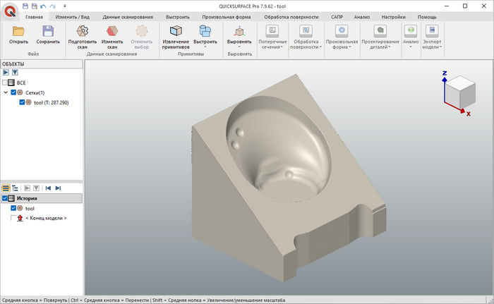 QUICKSURFACE Pro — это профессиональное решение ориентированное на инженеров и дизайнеров, работающих с 3D-сканированными данными и стремящихся преобразовать их в CAD-модели. Программа поддерживает импорт файлов сканов в форматах STL, OBJ, PLY, а также облака точек в формате PTX и может обрабатывать большие сетки.