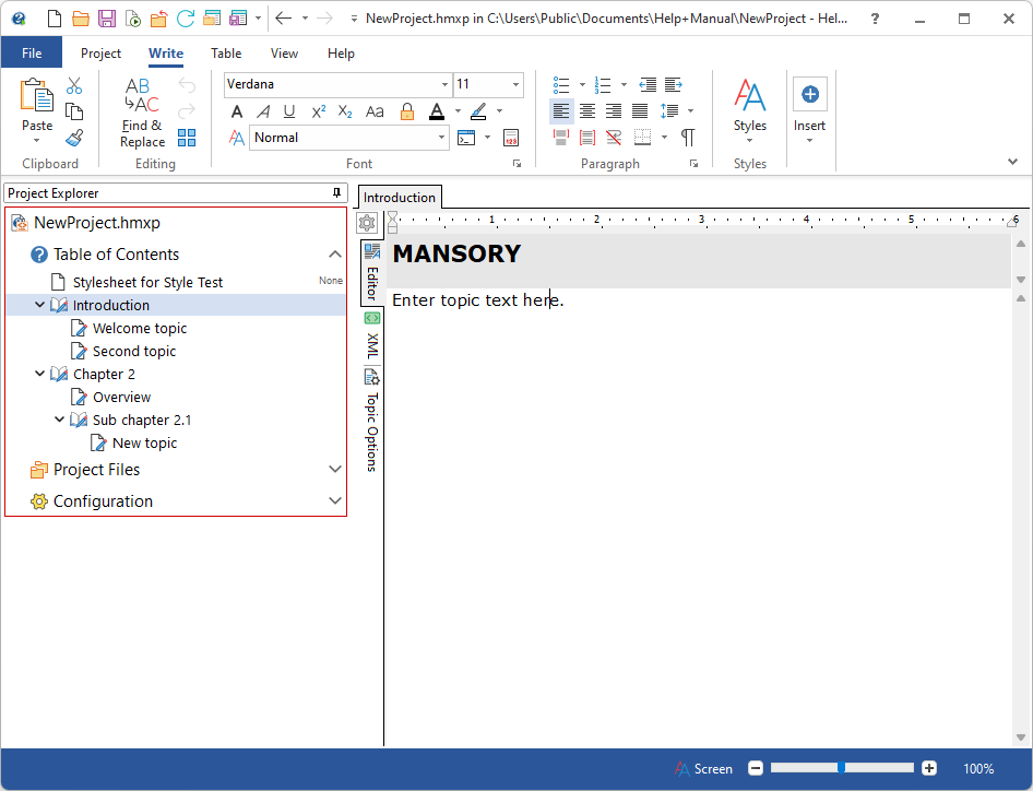 Редактирование и форматированиеHelp & Manual предоставляет пользователям все возможности изменения текста, включая применение динамических стилей и добавление комплексных таблиц, поддержку мультимедиа и модульных проектов. Проект просматривается и редактируется в иерархической структуре древа, при этом окна иерархии и работы с текстом совмещены в едином интерфейсе.