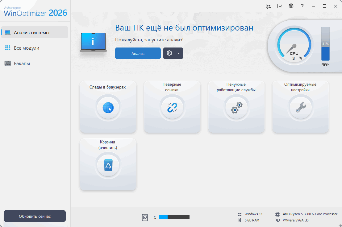 Ashampoo WinOptimizer 2026 технически совершенна и поставляется с новейшими чистящими средствами, тестами и инструментами! Ощутите повышение производительности, избавьтесь от лишних данных и повысьте конфиденциальность за считанные минуты.