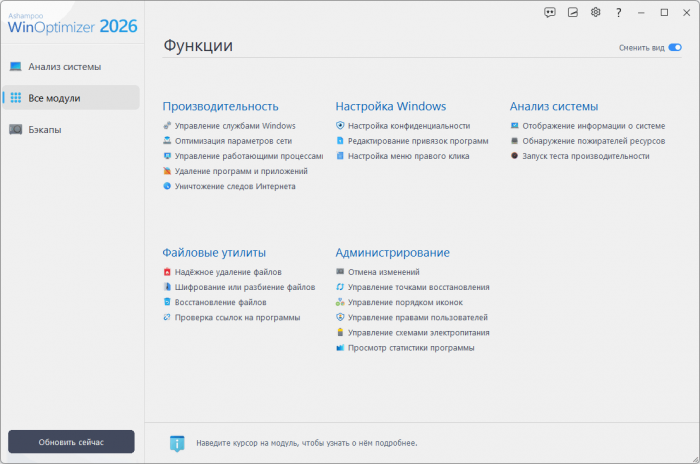 Обзор возможностейMicrosoft Windows не идеальна и не предлагает всех необходимых настроек, которые могут понадобиться требовательным пользователям. Со временем операционные системы становятся заметно медленнее, перегружены следами браузера, недействительными ссылками и ненужными программами. Ashampoo WinOptimizer 2026 обеспечивает быструю, чистую и надежную работу Windows всего несколькими щелчками мыши! Доступно 19 мощных модулей для анализа, оптимизации и настройки Windows. Все модули теперь построены на новой технической базе WinOptimizer 28, которая отличается улучшенной производительностью, более высокой стабильностью и передовыми технологиями. Популярный Internet Cleaner теперь работает на 25–50% быстрее и эффективнее, отображая подробные результаты очистки на совершенно новой панели статистики. Полностью переработанный System Information 2 предоставляет еще более точную информацию об оборудовании в новых категориях и отличается более понятным и структурированным интерфейсом для максимальной прозрачности. Privacy Manager представляет множество новых настроек, позволяющих еще точнее контролировать, какие данные собирает и передает Windows, восстанавливая полную конфиденциальность одним щелчком мыши. Разумеется, все мощные инструменты оптимизации, анализа, управления файлами и другими инструментами, ускоряющие, очищающие и персонализирующие Windows, по-прежнему на месте. Всё это упаковано в современный, интуитивно понятный дизайн, идеально соответствующий современным версиям Windows.