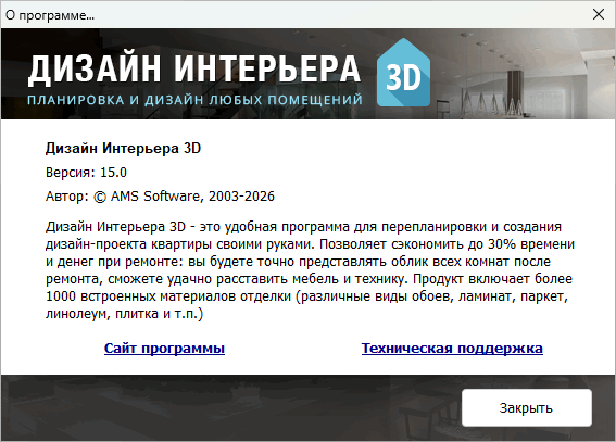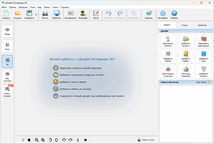 Дизайн Интерьера 3D — это простая и функциональная программа для проектирования квартир, домов и офисов, позволяющая самостоятельно создать полный дизайн-проект помещения с нуля: приложение объединяет инструменты для построения точной планировки, подбора отделочных материалов, расстановки мебели и проектирования инженерных коммуникаций, а также предоставляет возможность просматривать результат в 2D, 3D и режиме «вид изнутри» с реалистичной визуализацией.