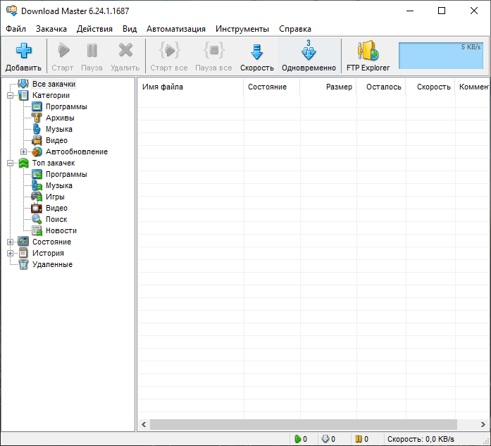 Download Master позволяет значительно повысить скорость закачки файлов через Интернет с использованием HTTP, HTTPS и FTP протоколов. Для этого используется разбиение файла на потоки, которые закачиваются одновременно. Программа также поддерживает докачку файла с текущей позиции после обрыва связи.