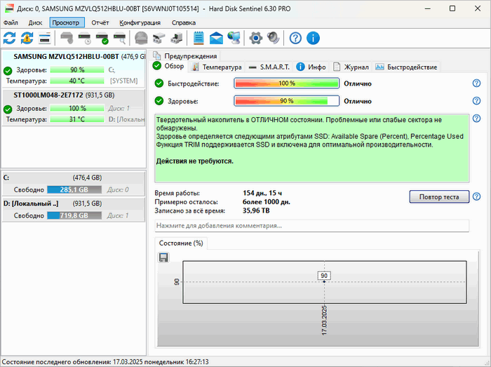 Работает в фоне и постоянно проводит анализ ситуации. В случае выявления ошибки или превышения порога определенных параметров, указанных пользователем, выведет предупреждение. В большинстве случаев на помощь приходит именно технология S.M.A.R.T., так как это один из наиболее быстрых и простых способов отследить изменение особо важных или критических параметров накопителей.