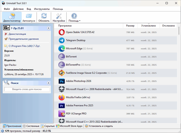 • просмотр детальной информации о любой программе, установленной на вашем компьютере