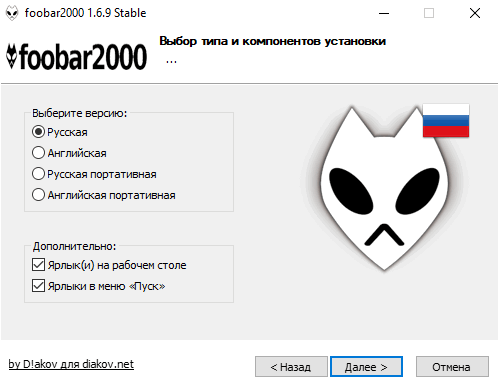 • Также возможен выбор каталога для установки: После всех ключей необходимо добавить /D=%путь% Пример: файл_установки.exe /S / R /D=C:\ foobar2000