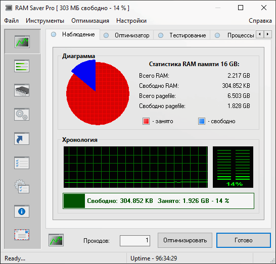 RAM Saver Pro - инструмент для профессионального мониторинга, очистки и оптимизации оперативной памяти. Скачав его на diakov.net, вы сможете увеличить производительность операционной системы, освободив оперативную память от драйверов и процессов Windows для приложений, нуждающихся в максимальной загрузке процессора и оперативной памяти. RAM Saver Pro дефрагментирует системную память для быстрого доступа к ней, улучшает эффективность работы процессора и кэша памяти, восстанавливает утечку памяти в плохо оптимизированных приложениях, временно помещает не используемые библиотеки и драйверы в swap-файл, освобождая RAM.