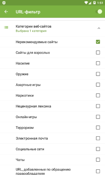 Облачный фильтр Cloud Checker ограничит доступ к нежелательным интернет-ресурсам. Блокировка доступа к нерекомендуемым и потенциально опасным сайтам производится по нескольким категориям (наркотики, насилие и т.д.).