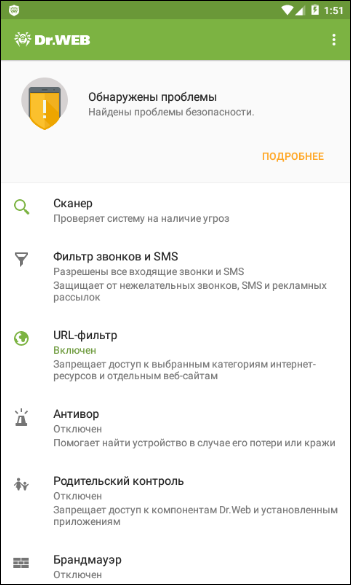 Примечание, может, кому надо: После установки Dr.Web может обновлять свою базу данных, но, каждый раз во время сканирования находит среди других вирусов – компонент Android.Thief.1 (имя может меняться не значительно) определяя его как вирус! Предлагая, при этом, его удаление, также, установочный пакет Dr.Web….apk – программа считает опасным вирусом. Android.Thief.1 — как угроза, представляет собой компонент активации антивирусного ПО в операционной системе Android. После его удаления Dr.Web работать бесплатно не будет…