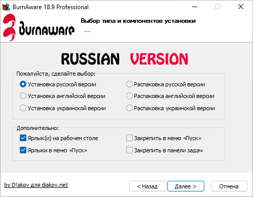 • Также возможен выбор каталога для установки: После всех ключей необходимо добавить /D=%путь% Пример: файл_установки.exe /S /rus=1 /D=C:\ BurnAware