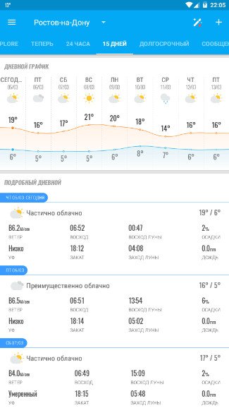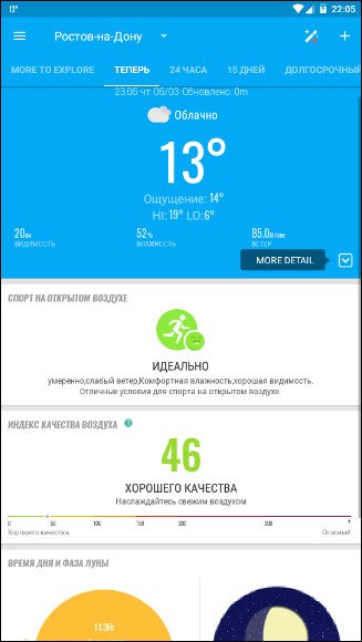• Детализированная информация о погоде: температура на данный момент, скорость и направление ветра, атмосферное давление, влажность воздуха, видимость, точка росы, индекс ультрофиолета.