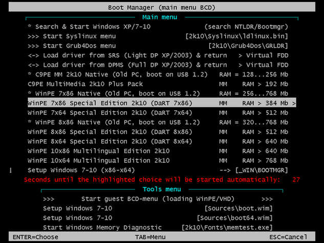 1. Загрузчик WEE. Ставится полностью в MBR (PBR игнорируется), занимает 63 сектора (нестандартно!). Есть встроенное меню (можно править при установке), позволяющее найти и загрузить NTLDR, BOOTMGR, GRLDR,... В связи с нестандартностью не рекомендуется для универсальной флешки, но очень удобно, например, в качестве Boot-менеджера на системном диске.