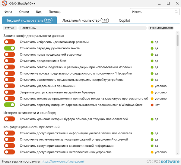 Скачать программу O&O ShutUp10 2.1.1015 (75 МБ):