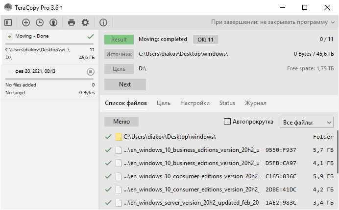 Также TeraCopy позволяет останавливать/восстанавливать копирование информации, повторять попытки записи при обнаружении ошибок или пропускать обработку отдельных файлов.