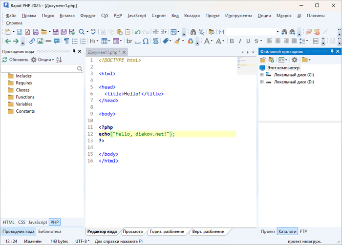 Rapid PHP — полноценный и быстрый редактор PHP, возможности которого выходят далеко за рамки среды обычного PHP редактора. Удобные возможности позволят Вам создавать и редактировать не только PHP, но и HTML, XHTML, CSS и jаvascript коды, в то время как интегрированные инструменты позволят Вам с легкостью проверять, многократно использовать, ориентироваться и форматировать Ваш код. Не важно являетесь ли Вы профессиональным разработчиком или просто энтузиастом, с редактором Rapid PHP Вы сможете справиться с поставленной задачей быстрее, сэкономить время и повысить продуктивность. Функции включают в себя подстветку синтаксиса, примеры кодов, подсказки PHP-функций, поиск и замену, ftp-клиент и многое другое. Имеет большое количество инструментов для проверки корректности кода, удобной навигации по коду, форматированию и т.д.