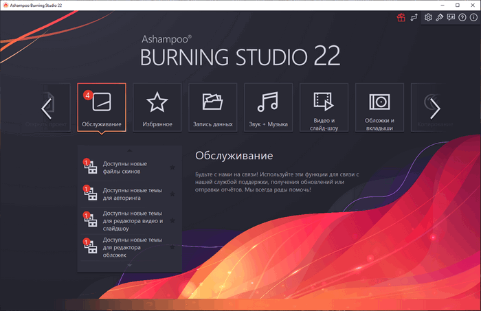 - Интуитивная, мощная и гибкая. Король удобства использования! От начальной страницы и до окна параметров, Ashampoo Burning Studio 22 обладает отлично выстроенным, интуитивным интерфейсом пользователя, который доступен более чем на 40 языках. Движок, техническая реализация были подвержены тысячам часов тестирования и гарантируют стабильность и надёжность Вам и Вашим данным. Вы можете настраивать внешний вид программы с помощью различных встроенных скинов или создать свой при первом запуске.