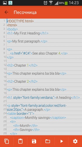 • песочница - создайте свой код, просмотрите его в браузере, гибкие настройки;