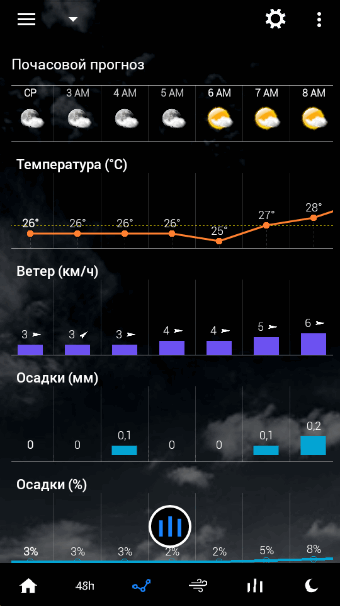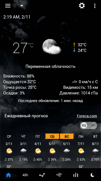 • Влажность, давление, вероятность дождя, точку росы, видимость, УФ индекс и ветровые условия