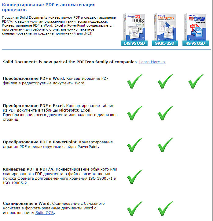 Solid PDF Tools - это ведущий конвертер PDF файлов в редактируемые документы Windows. Если вам необходимо получить содержимое PDF файла в форматах Microsoft® Word, Excel, PowerPoint, HTML или в текстовом документе, использование Solid PDF Tools - это простой и надежный способ.