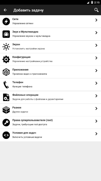 Задачи, позволяющие Вам автоматизировать Ваш телефон, разбиты по категориям во вкладке "Задачи".Вот несколько примеров возможных действий: