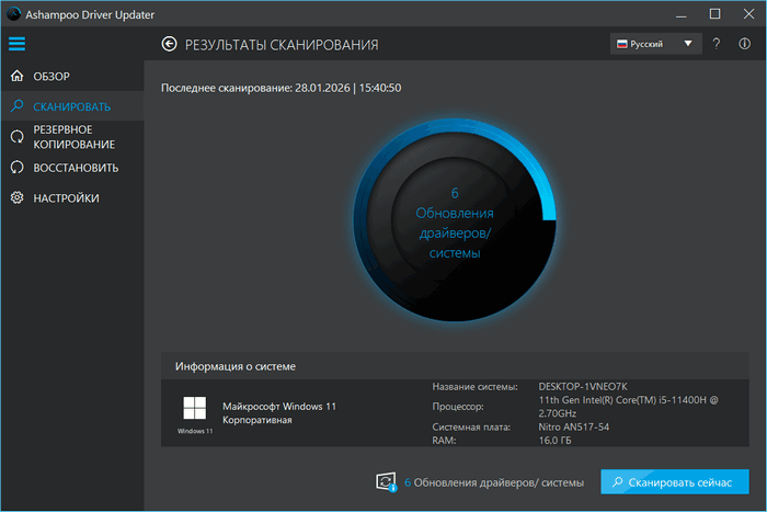 Просканировал - установил - готовоВам не нужно скакать по меню в Ashampoo Driver Updater. Программа с отличным дизайном выполняет свою работу по поддержанию Вашего компьютера в актуальном состоянии быстро и с высоким уровнем удобства. Она анализирует аппаратное обеспечение и драйверы, сравнивает результаты с гигантской базой данных, а затем заменяет устаревшие драйверы их самыми свежими версиями.
