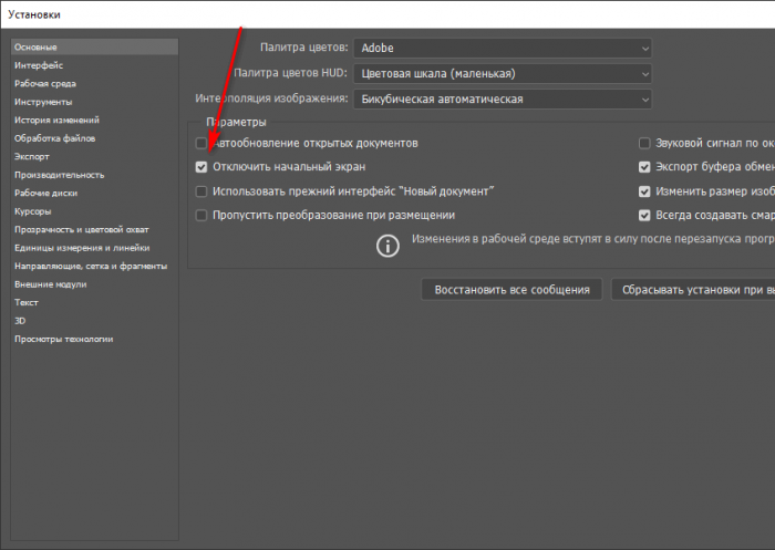 diakov,достаточно одну а не две галочку поставить"Отключить начальный экран", что бы экрана вечной загрузки не было.И к тому же кому нужно, будет функционировать новый интерфейс при создании нового документа.У меня вот так получилось.Спасибо Вам за то,что Вы для всех нас делаете.